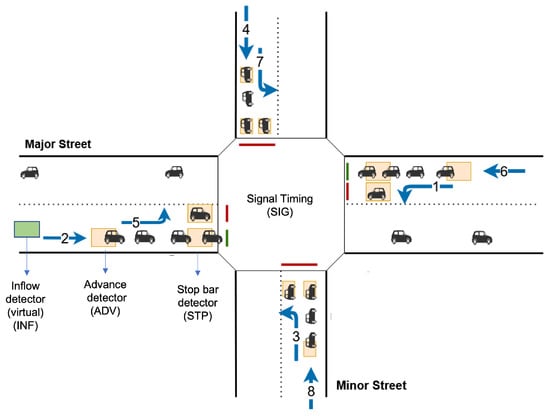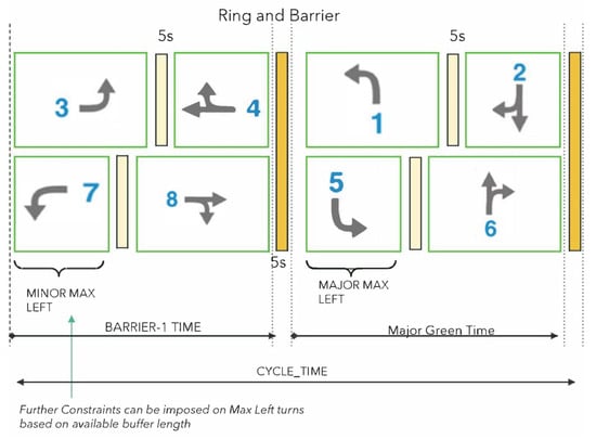 It is convenient to think of the time period of an intersection in terms of cycles. A complete cycle consists of a predetermined sequence of traffic phases, where a traffic phase consists of green time allocated to a set of lanes simultaneously for non-conflicting movement of traffic through an intersection. The cycle length is the time interval of a complete cycle and can vary from one cycle to the next. Within a cycle, a green split is the time interval allocated for a particular traffic phase. A ring and barrier controller allows us to separate the 8 lane-movements (i.e., phases 1–8) into two concurrency groups, with one group with the major street movements and one for minor street movements (or more generally, opposing direction flows).