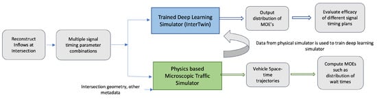 Our deep learning approach (called InterTwin as a short form for Intersection Twin) uses a large amount of data from different intersection topologies and signal timing plans, so as to capture the underlying traffic behavior at an intersection. While several real-world datasets exist [5], they are limited to only currently-used signal timing plans. We use microscopic simulators in conjunction with real world data to derive MOE distributions for a variety of scenarios that encompass a broad range of signal timing plans. Using this data, we built our models. The following are the key contributions of our work: