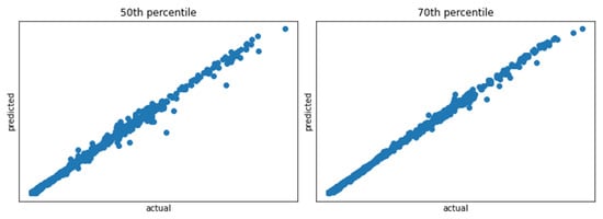Summary statistics such as 50th/70th percentile etc. can be computed from the predicted distribution. Actual vs. predicted scatter plot of 50th, 70th percentile of wait time computed from the distribution. The key advantage is that predicting distribution enables us to compute any statistic of interest.