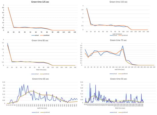 Actual vs. predicted distribution of wait time for different green time splits for a given input traffic. These plots show that the model is able to capture the interrelationship between input traffic and signal timing parameters.