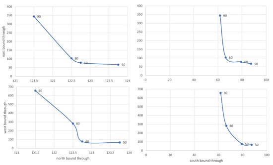 The 75th percentile of wait times as MOE is used for the rest of this discussion. In general, adding more time to the major street results in increased wait time on the minor street. The tradeoff can be clearly seen in Figure 7. It shows a scatter plot of 75th percentile of wait times for major vs. minor movements for different barrier-1 times (Figure 1). Based on this plot, a value of 60–70 s of green time may be appropriate as it minimizes the wait time on major street while not significantly impacting the wait time on the minor street. Of course a traffic engineer can look at these plots and other constraints to derive the optimal values. Given that our approach is computationally very inexpensive, optimal values can be derived separately for various hours of the day and day of the week combinations.