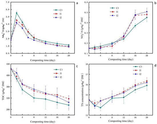 As shown in Figure 3d, TN content showed a trend of slightly decreasing first and then increasing in the three treatments during the whole composting process. The minimum TN content value was detected in the C1 treatment on day 4 and I1 and I2 treatments on day 2. The TN content of C1, I1, and I2 peaked at the end of composting with 15.91 g/kg DM, 16.35 g/kg DM and 16.21 g/kg DM, respectively. During the whole composting process, the TN content of C1 treatment was lower than that of I1 and I2.