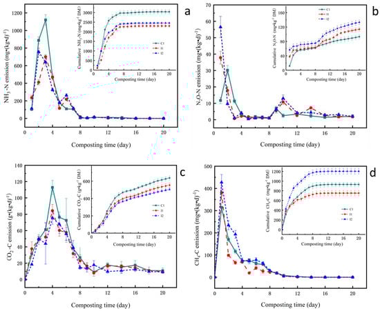 CO2 emission flux during composting of all treatments is shown in Figure 4c, which increased rapidly in the early stage and peaked value 112.86 g, 84.27 g, and 75.67 g on day 4, respectively, and then gradually decreased by the end of the thermophilic phase. CO2 emissions of all three treatments during the thermophilic period account for more than 70% of total CO2 emissions. The cumulative CO2 emission of C1 treatment (636.91 g/kg DM) was the highest, which was 13.01% and 20.72% higher than that of I1 and I2 treatment, respectively.