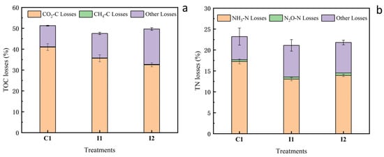 The carbon and nitrogen losses from NH3 and GHG emission are presented in Figure 5. Throughout the composting process, more than 47% of the TOC has been lost, of which 32.50–40.99% and 0.13–0.21% were lost in the form of CO2 and CH4. The CO2-C loss comprised 65.44–79.97% of TOC loss, so CO2 emission was the principal pathway for the TOC loss in this study. The data analysis showed the TOC loss of C1 treatment was higher than that of I1 and I2 treatments.