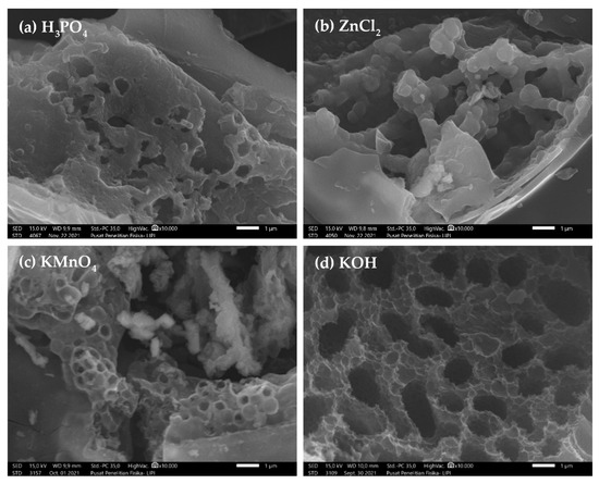 - Suhdi; Wang, S.-C. Fine Activated Carbon from Rubber Fruit Shell Prepared by Using ZnCl2 and KOH Activation. Appl. Sci. 2021, 11, 3994. [Google Scholar] [CrossRef]