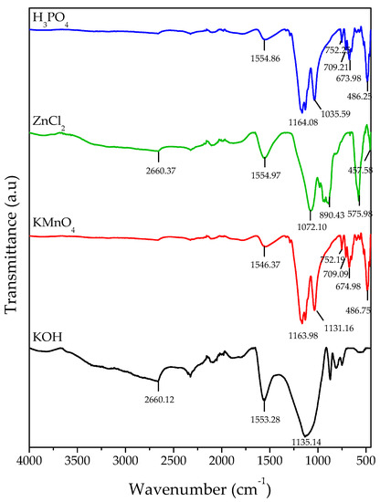 - Qanytah; Syamsu, K.; Fahma, F.; Pari, G. Characterization of ball-milled sago pith waste-based activated carbon treated with KOH and KMnO4 as activating agent. IOP Conf. Ser. Mater. Sci. Eng. 2020, 935, 012043. [Google Scholar] [CrossRef]