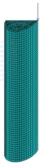 To control the accuracy of the equations obtained and the developed methodology, the first step was to solve the test problem in elastic formulation with subsequent comparison in the LIRA-SAPR software package [30]. The solution was carried out with the following initial data: D = 0.3 m, δ = 2 mm, Eb = 3 × 104 MPa, Es = 2 × 105 MPa, F = 100 kN, e = D/2, νs = 0.3, νb = 0.2. By virtue of symmetry, half of the cross-section was considered. The LIRA-SAPR software package solved the problem in the three-dimensional formulation, volumetric prismatic FE modeled concrete, and the steel shell was modeled by flat shell FE. To exclude local effects at the point of application of the force, the plate of high rigidity was installed at the upper end of the column. The calculation scheme is shown in Figure 4.