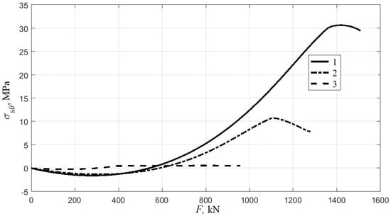 Figure 9 and Figure 10 show the theoretical graphs of changes in stresses σsθ at y = -R (at the point with the lowest absolute value of the compressive stresses σsz) and y = R (where the highest compressive stresses along z occur) depending on the load for columns 1–3 in Table 2.