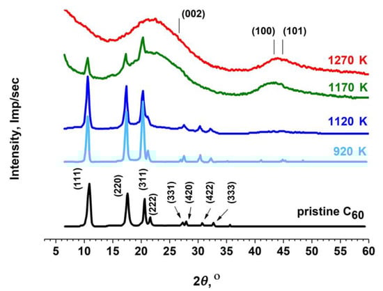 With a further increase in temperature to 1120 K, a slight broadening of the main diffraction peaks is observed, indicating the formation of covalent C−C bonds and a change in the distances between the molecules. The appearance of two wide-diffuse lines located in the 15–30° and 40–50° regions on diffractograms is the beginning of the C60 cluster destruction. When the temperature rises to 1170 K, the destruction increases, and at 1270 K the diffraction lines in the angle range of 10–24°, characteristic of the molecular cluster, disappear and two wide lines at angles of ~22° and ~44° are observed. The obtained data demonstrate that the limit of the cluster C60 thermal stability at a pressure of 0.1 GPa is ~1000 K and corresponds to the thermal stability limit of the C60 fullerene molecule at atmospheric pressure []. The diffraction patterns of the fullerite sample at a temperature of 1270 K are qualitatively similar to the ones of the materials formed at the carbonization final stages and graphitization initial stages of various carbon-containing compounds [,,,,]. Their diffraction patterns are also characterized by the presence of several wide diffuse lines.