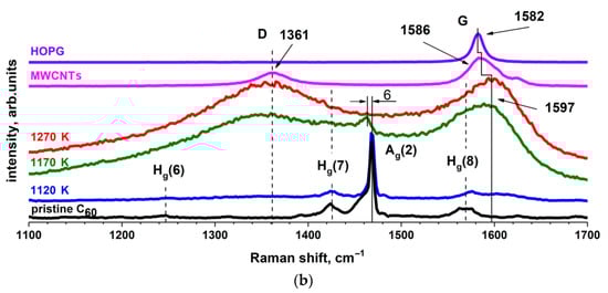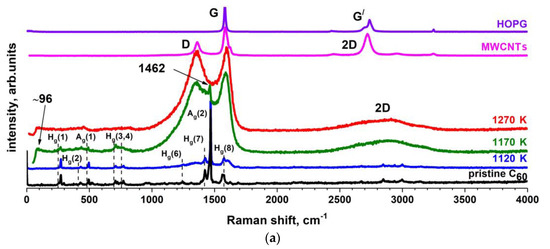 Figure 3 shows that the spectra of the modified fullerite have significantly widened G, D and 2D bands. A comparison of the Raman spectrum of the fullerite C60 with those of HOPG and MWCNTs (Figure 3b) shows that the energy position of the D band of C60 is consistent with its position in the HOPG and MWCNTs spectra, while the position of the G band (1597 cm−1) undergoes a low energy shift of 11 cm−1 for MWCNTs (1586 cm−1) and 15 cm−1 for HOPG (1582 cm−1). An essential point is the absence of narrow 2D peaks in the range of 2300–3200 cm−1 in the spectrum of the HIP-treated C60, and only a weakly modulated very wide band is present. The absence of peaks in the 2300–3200 cm−1 region of Raman spectra in the three-stage model of classification of the graphite disorderliness degree during the transition from graphite to amorphous carbon [] suggests that fullerite C60 after HIP treatment is an intermediate material between the first (nanocrystalline graphite) and the second (mainly sp2 or low sp3 amorphous carbon) stages.