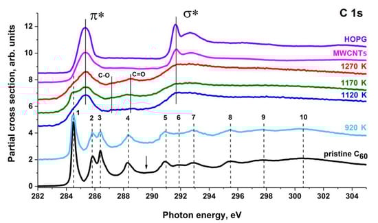 In the NEXAFS spectrum of C60 powder after HIP treatment at 1120 K (Figure 4), there are two bands associated with carbon-oxygen groups, the intensities of which are enhanced with the treatment temperature increasing. The reason for the appearance of these bands is the interaction with molecular water, which was adsorbed on the pristine C60 powder surface. As discussed earlier in Section 3.1, the formation of carbon oxides [] occurs already at 570 K, but the corresponding peaks in the sample C 1s NEXAFS spectrum of the sample at 920 K are not observed.