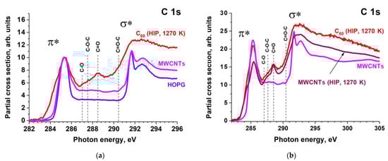 As can be seen from the C 1s core-level PE spectrum (left inset in Figure 6) the main C 1s peak is asymmetric and splits into four components at the BE of 284.7 eV (C–C), 286.5 eV (C–O), 287.6 eV (C=O) and ~290 eV (O=C–O). The O 1s peak (right inset in Figure 6) is symmetric and the separation of O 1s signals associated with different oxygen-containing groups and adsorbed water molecules is not possible. From a comparison of the peak areas of the C 1s and O 1s XPS spectra of the C60 powder treated with HIP, it was found that the ratio of the number of oxygen atoms participating in the formation of oxygen-containing groups and the adsorption of water molecules on the sample surface to the number of carbon atoms, is about of 3%. The presence of a broad band at a BE of ~290 eV in C 1s XPS spectrum explains the appearance of a wide shoulder at the low-energy side of the σ* absorption band in C 1s NEXAFS spectrum of the MWCNTs and HIP-treated fullerite (Figure 6) as the contribution of C1s → π* transitions in the O=C−O group [].