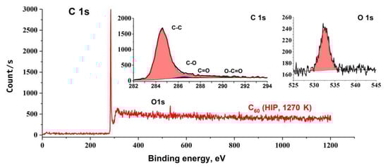 The high sensitivity of the C 1s NEXAFS spectrum of the new carbon material to the presence of the C−O, C−O−C, O=C−O and C=O functional groups is due to the high oscillator strengths of C1s → π* transitions in such linear atomic groups. Therefore, even at small oxide concentrations, their presence is manifested in C 1s NEXAFS spectra. To determine the quantitative atomic concentration of oxygen in the fullerite C60 powder after HIP treatment at 1270 K, its C 1s XPS spectra were measured. The overview XPS spectrum of the C60 powder after HIP treatment at 1270 K (Figure 6) contains a C 1s peak at 284.7 eV (FWHM is 1.4) and a broad O 1s line at 532.7 eV (FWHM is 2.6). The XPS measurements allow the determination of the relative atomic concentration of oxygen on the HIP-treated powder C60 surface equal to 4%. The O 1s peak in the XPS spectra indicates the presence of oxygen-containing compounds on the sample surface (carbon oxides as well as water and oxygen molecules physically adsorbed from the atmosphere).