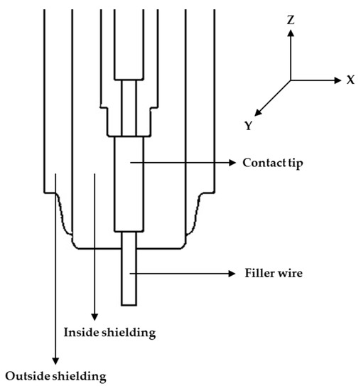 As the welding power source, a constant-current-type GMA welding machine with a capacity of 1500 A was used. The welding power source used in the experiment was a general commercial welding machine without special controls, such as a synergic program. Since the welding power source was a constant-current type, the wire feed rate was slightly variable. Therefore, the welding current was set instead of the wire feed rate. Welding current and voltage were 600 A and 34 V, respectively. Contact tip to work distance (CTWD) was 45 mm, and the travel angle was fixed at 10° push. The welding speed was set to 50 cm/min, which is relatively fast to minimize the welding heat input in the first pass (the upper surface), and 30 cm/min in the second pass (the lower surface). Figure 1 shows a schematic design of a double-shielded GMA welding torch. A double-shielded GMA welding torch was used with an inside shielding gas to reduce turbulence and an outside shielding gas to protect the arc from the atmosphere. The shielding gas was supplied at 110 L/min by mixing 99.9% argon and 99.999% helium in a 5:5 ratio using a gas mixer inside the double torch and 99.9% argon at 80 L/min outside the double torch.