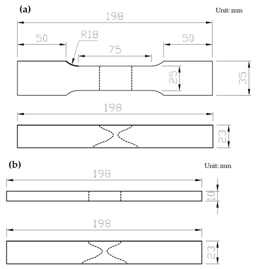 Schematic design of test specimen: (a) tensile strength test; (b) bending test.
