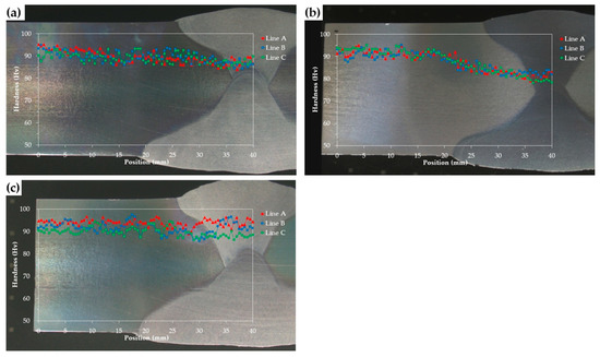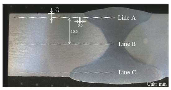 The hardness test was performed using a Vickers hardness tester. As shown in Figure 4, each specimen was divided into three lines, and hardness was measured along the three lines. Line A was defined as an imaginary line 2 mm below the upper surface of the weld, line B was set in the middle line of the weld, and line C was defined an imaginary line 2 mm above the lower surface of the weld. Then, the hardness was measured at HV 0.1, and, for each line, from the heat-affected zone to the center of the deposited metal zone, 81 points were estimated at 0.5 mm intervals, for a total of 40 mm.