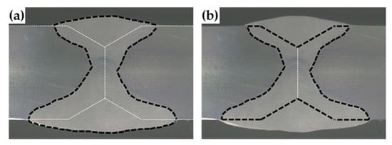 The dilution rate of the weld was measured by Figure 5 and Equation (1). The dilution rate is calculated by dividing the area of the molten metal by the sum of the areas of the deposited metal and the molten metal.