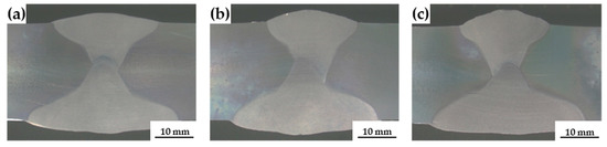 Cross-section of aluminum 5083 alloy gas metal arc welds using filler wires with different magnesium and manganese contents: (a) W1; (b) W2; (c) W3.