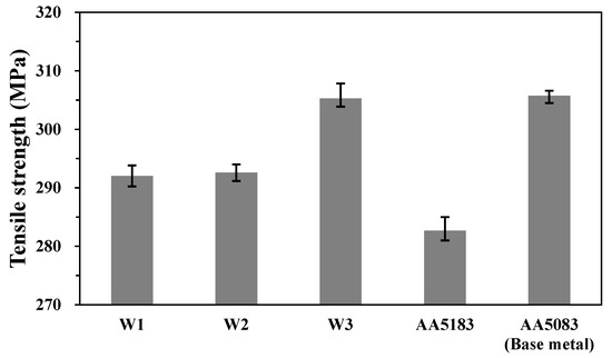 Figure 8 shows the tensile test results using the filler wires with different magnesium and manganese contents. In the case of the weld using W1 and W2, the average tensile strengths were 292 MPa and 293 MPa, respectively. An attempt was made to compare the strengths of the W1 and W2 welds to the difference in the magnesium content of the filler wire, but the tensile strengths of W1 weld and W2 weld did not show significant differences. However, the W3 weld showed an average tensile strength of 305 MPa, despite the lower magnesium content than the W1 weld, and its highest tensile strength was 310 MPa. In the results of Kwon [6], the magnesium concentration and strength of the filler wire were said to be linearly proportional, but the above experimental results showed non-linear results. The weld using commercial aluminum 5183 alloy wire had an average of 283 MPa and showed the lowest strength compared to the welds of the three types of manufactured wires, W1, W2, and W3.