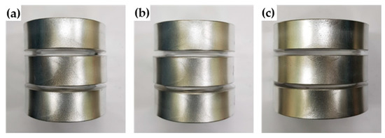 Figure 3 shows schematic designs of the tensile test specimen and the bending test specimen. To minimize the notch effect, which is prone to fracture due to the generation of concentrated stress when external forces, such as fatigue or impact, are applied to the welded specimen, the tensile test specimen and the bending test specimen were milled 1 mm from the upper surface and 1 mm from the lower surface. The thickness of the tensile test specimen is 23 mm. Three tensile test specimens were machined for each weld, each tensile test was performed, and then the tensile strength was obtained as an average value. The bending test was performed by producing a transverse-sided bending test specimen. The bending test method was a roller-type guided bending. The bending test was repeated three times for each weld zone because the results may vary due to defects, such as pores. After the bending test, defects, such as cracks appearing on the surface of the bent part, were examined by visual inspection. The standards for manufacturing the specimens and the test method standards are in accordance with AWS D1.2.