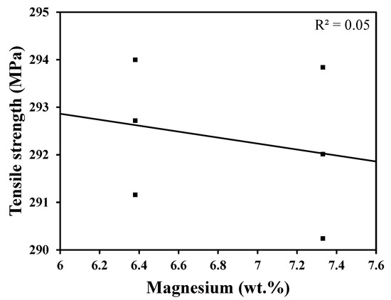 Figure 12 shows the regression analysis results on the magnesium content of filler wire and tensile strength of welds in aluminum 5083 alloy GMA welding. The W1 weld, with almost no manganese (0.003 wt.% or less) and 7.33 wt.% of magnesium, was compared with the W2 weld, with almost no manganese (0.004 wt.%) and 6.38 wt.% of magnesium, and analyzed. The coefficient of determination (R-squared) of the regression formula was 0.05. When the magnesium content of the aluminum alloy filler wire was 6 wt.% or more, the tensile strength and the magnesium content were not linearly proportional. However, as shown in the results of the W2 weld and the W3 weld of Figure 8, when the magnesium content of the aluminum alloy filler wire is higher than that of commercial products (6 wt.% or more), the strength of the weld is improved according to the addition of manganese.
