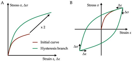 The simplified assumption of cyclically stabilised material behaviour is often made within analytical fatigue assessments using strain-based concepts; e.g., [,,,,]. This is mainly motivated by the fact that the number of material parameters required for the material model used can be kept within a reasonable range for a practical application. Throughout the literature, however, there are various complex approaches that promise to represent the physical cyclic material behaviour more accurately—see, e.g., [,,]. Assuming a cyclically stabilised material behaviour, the deformation of the material during initial loading is described by Equation (3). The stress–strain path at load reversal is described according to Masing’s behaviour [], with the initial load curve doubled in stress and strain—see Equation (6) and Figure 1A. The doubled initial load curve is referred to as a hysteresis branch below.