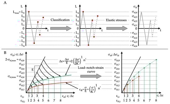 For the application of the FKM guideline nonlinear, the load-time history is classified, which means that only a discretised load–notch-strain curve is required. The class width for the discretisation is determined by dividing the largest load Lmax by the number of classes. The FKM guideline nonlinear suggests using a total of 100 classes between L = 0 and L = Lmax; whereas in Figure 3A, a class number of 4 is used for didactic reasons. In the classification, the load at each reversal point is shifted to the next largest class limit in terms of absolute value; see the red points in Figure 3A.