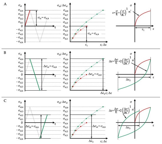 Due to Masing’s behaviour, the local stress–strain path after load reversal does not follow the shape of the initial load curve (Equation (3)); instead, it follows the double initial load curve, the so-called hysteresis branch (Equation (6)). Therefore, in addition to the load–notch-strain curve for the initial load, the load–notch-strain curve for the hysteresis branch must also be determined. Within the load sequence, maximum stress ranges Δσel, which correspond to twice the maximum elasticity-theoretical stress σel,max, can occur. The load–notch-strain curve for the hysteresis branch is therefore determined for elasticity-theoretical stresses of up to 2∙σel,max, and is shown in green in Figure 3B.