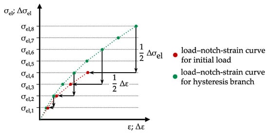 Between the load–notch-strain curve for the initial load and the load–notch-strain curve for the hysteresis branch, there exists a relationship by which the load–notch-strain curve of the initial load can be inferred from the load–notch-strain curve of the hysteresis branch without simulation. By halving the ranges of the elasticity-theoretical stress Δσel and the strain ranges Δε of every second class of the load–notch-strain curve of the hysteresis branch, the load–notch-strain curve of the initial load is obtained []; see Equations (9) and (10), where nC is the number of classes. Figure 5 illustrates this procedure, following the descriptions given in Section 2.2. Due to this connection, it is only necessary to carry out the FEA with the double stress–strain curve according to Equation (6) for the hysteresis branch; the load–notch-strain curve for the initial load can be calculated from this. Thus, one-third of the load steps to be simulated are unnecessary.