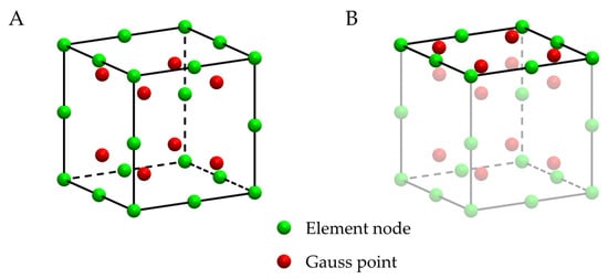 Gauss points and element nodes: (A) hexahedron element (Ansys Solid186); (B) hexahedron element with shell element (Ansys Shell281) on one surface.