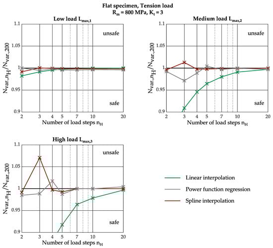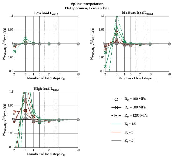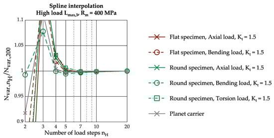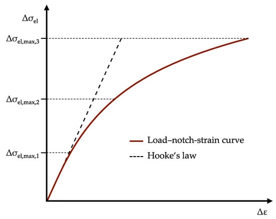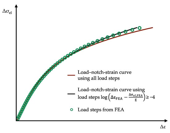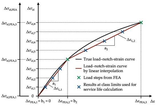 Figure 7 shows the procedure for two simulated load steps nH = 2. As a result of the FEA, the strains ΔεFEA,2 and ΔεFEA,3 are obtained for the applied loads Δσel,FEA,2 and Δσel,FEA,3. The values for the load–notch-strain curve at the class limits are taken from the interpolated red curve by inserting the elasticity-theoretical stresses Δσel at the class limits into Equation (13). As the number of simulated loads increases, the interpolated load–notch-strain curve approaches the true curve.