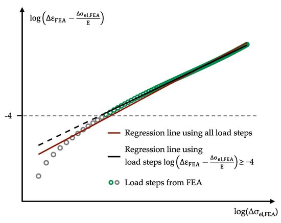 In the regression, only pairs of values from Δσel,FEA and ΔεFEA from FEA that fulfil the condition log(ΔεFEA − Δσel,FEA/E) ≥ −4 are considered. In the case that less than two load steps are necessary to perform a linear regression to fulfil the condition log(ΔεFEA − Δσel,FEA/E) ≥ −4, all load steps for which ΔεFEA − Δσel,FEA/E > 0 are used. This last restriction is necessary because in the range of low loads, a negative difference ΔεFEA − Δσel,FEA/E can occur due to numerical inaccuracies during the FEA. Since the logarithm can only be applied to values greater than zero, only data pairs for which ΔεFEA − Δσel,FEA/E > 0 applies are considered.