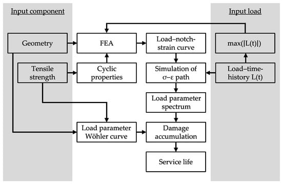The notch strain concept, also known as the local strain approach, can be found in many variants throughout the literature [,,,,]. These differ primarily in the procedures used to determine the local stresses and strains; e.g., the notch root approximations [,,,,,,,,,,], and in the so-called load parameters (also known as mean stress parameters or damage parameters) used to evaluate the damage of individual stress–strain hystereses [,,,,,,,]. Both can have a significant influence on the calculation result of a component’s fatigue life. In addition, the calculation procedures used for the notch strain approach—regardless of how it is expressed—can only be applied with the help of computational algorithms, since, for example, numerical solution procedures need to be used. Therefore, the calculation result also depends to a certain extent on the user-specific implementation of these calculation algorithms.