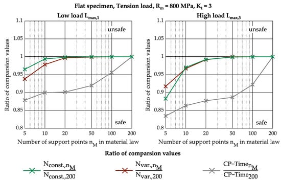 As described in Section 3.1, it is sufficient to determine the load–notch-strain curve for the hysteresis branch by simulation. For the material in the FE model, the material behaviour according to Equation (6) must be stored as nonlinear hardening. Since only single-sided increasing stresses are simulated in the FEA, it is irrelevant whether kinematic or isotropic hardening is used, since in both cases the same stress–strain path results up to the first load reversal point []. In commercial FE programs (such as the Ansys Workbench software used in the following), the material law is often not specified as a function, but as a path of linear sections. The number of supporting points of the material law nM has an effect on the calculation time and accuracy of the load–notch-strain curve.
