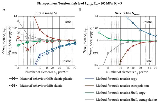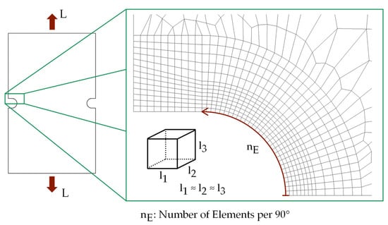 An FEA with elastic-plastic material behaviour requires a significantly longer calculation time compared to an FEA with purely elastic material behaviour. The calculation of the load–notch-strain curves via the method described in Section 2.3 is therefore associated with considerable effort, which makes the application appear less attractive compared to the notch root approximation. This section therefore describes the following influences on the quality and efficiency of the simulative determination of load–notch-strain curves: