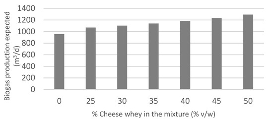 Keeping the conservative assumption of no synergies, then it is evident that adding a low organic content co-substrate for attaining just a 34% gas improvement may not be worthwhile, given the additional investments necessary for transporting and storing the co-substrate. Other authors have reported the use of more concentrated whey streams, as it is the case of Gonzalez-Piedra et al. [91] with a TS content of 134.87 g/L or Hallaji et al. [92] reporting a solid content of cheese whey of 84.3 g TS/L. The availability of such type of material will highly enhance biogas production.