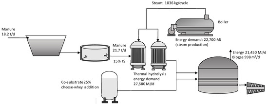 The enhancement considered 20% increase in methane yield, which translates into 3230 MJ/d. The additional energy obtained from the digestion of hydrolyzed manure is much lower than the amount needed to run the whole process (see Figure 5). A deficit of 24,350 MJ is the result of installing such a technology (value estimated considering the treatment of manure as a single substrate). Even if a higher biogas enhancement is assumed, then the extra energy obtained will be consumed in running the thermal pre-treatment. Liu et al. [31] came to the same conclusion when evaluating thermal pre-treatment of different wastes (food wastes, swine manure and sewage sludge). These authors tested mesophilic and thermophilic digestion of the hydrolyzed wastes indicating that the increased energy benefits by thermal hydrolysis did not cover the energy demand of the pre-treatment.