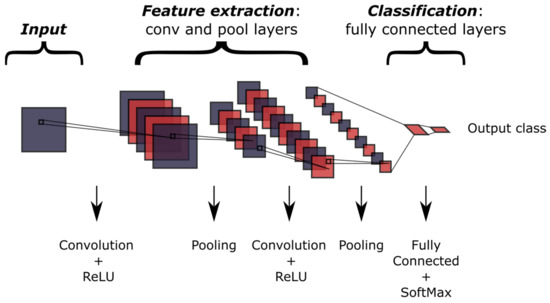 Convolutional neural networks (CNNs) consist of deep layered architectures, in which multidimensional algebra operations are carried out sequentially. These architectures match especially well with multidimensional data since the spatial information of the latter is preserved while being treated. For instance, the algebraic representation of RGB images needs two dimensions for populating pixel matrices, and a third dimension for RGB channels. The capabilities of CNNs were originally exploited for image classification tasks [22,50], but nowadays the potentials of these deep architectures are acknowledged in numerous fields concerning multidimensional data [25,26,27,42,51]. Generally, CNNs include three types of layers, corresponding to specific operations: convolution, pooling, and fully connected layers (Figure 1).