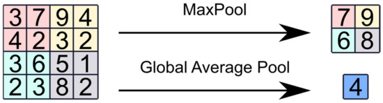 Pooling layers usually follow convolutional layers in CNNs architectures (Figure 1). The output of pooling layers is a low-resolution feature map, which is obtained through downsampling the input map. Pooling operations reduce the number of network parameters in order to mitigate data overfitting. Furthermore, the low-dimensional outputs of pooling layers extract local features, while preserving the multidimensionality of data. An example of downsampling is provided by the Max Pooling function, which only saves the maximum value of the input map in the regions passed by the filter. Instead, Global Average Pooling performs a global mean over the input map (Figure 3).