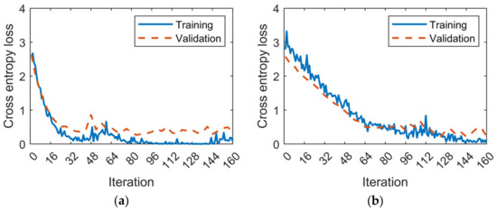 The Adam optimizer was employed for adapting the learning rate during training [53]. The batch normalization process [59] normalizes mini batches of data for each network channel independently. Such a normalization occurs within layers, thus preventing exploding gradients issues. Over an entire iteration, a mini batch set is passed through the network, whereas a whole epoch involves the complete training set. The validation frequency specifies the number of iterations elapsed between validations. The trend of the loss functions was monitored over the training process. As an example, Figure 8a shows the loss function resulting from training with dataset C.