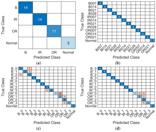 Test confusion matrices: (a) dataset A; (b) dataset B; (c) dataset C; (d) dataset C with dropout layer.