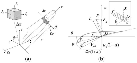 (a) Schematic of blade element momentum method and (b) blade element forces.