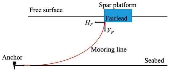 in which and are horizontal and vertical distances from fairlead to anchor (Figure 2); and are horizontal and vertical mooring tension components at fairlead; means mooring line relaxation length; represents wet weight per unit length of mooring lines; indicates mooring line unstretched length; EA is mooring line axial stiffness; and means static friction coefficient between mooring lines and seabed. By solving Equations (24) and (25), mooring tensions at fairlead can be calculated.