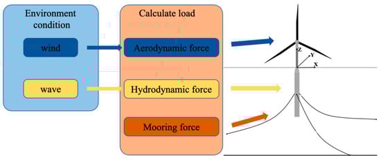 The entire calculation flow chart for the floating wind turbine dynamic response is presented in Figure 3, including aerodynamic analysis for wind turbine blade, hydrodynamic analysis for wind turbine tower and spar-type platform, quasi-static analysis for mooring system, and overall movement calculation for entire floating wind turbine. All of the external forces (i.e., wind, wave, mooring) are summed up in each time step, and floating wind turbine dynamic response can be solved iteratively.