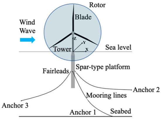 It is assumed that a positive x direction is consistent with the wind and wave propagation direction; positive z direction points upward; and positive y direction can then be determined using the right-hand rule, as can be seen in Figure 4. Figure 4 shows a typical OC3-Hywind spar-type 5 MW offshore wind turbine, which is moored onto the seabed using three mooring lines. The floating wind turbine can freely move in six directions (i.e., surge, sway, heave, roll, pitch, and yaw). The key structural parameters of the wind turbine are summarized in Table 1. Hub mass, nacelle mass, and tower mass are 56,780, 350,000, and 249,718 kg, respectively. Nacelle is measured to be (14.2, 2.3, and 3.5) m in (x, y, z) directions. Wind turbine draft is 120 m. Tower bottom and hub elevations from still sea level are 10 m and 90 m, respectively.