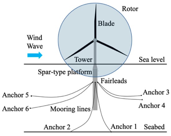 This study proposes a novel mooring system with six mooring lines for a spar-type floating offshore wind turbine. Three and six fairleads were utilized in the developed mooring system. When there were three fairleads, the effects of the included angle between the two mooring lines in the same group on mooring system performance were examined by varying the included angle to 20°, 30°, and 40°. When there were six fairleads, the mooring lines were uniformly connected around the spar-type platform. FAST was employed to simulate the wind and wave interaction of the floating wind turbine. Wind turbine surge, pitch, and yaw movements were analyzed in time and frequency domains to quantitatively examine the developed mooring system performance. The following conclusions are drawn: