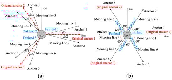 Developed mooring systems with (a) three fairleads and (b) six fairleads.