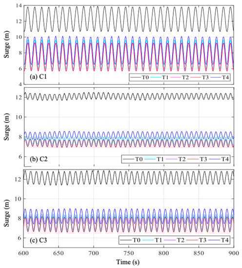 Figure 7 presents wind turbine surge movements from 600–900 s in C1–3. It can be obviously seen that wind turbine surge movement with the original mooring system T0 was larger than the developed mooring systems T1–4. Wind turbine surge movement with the original mooring system oscillated near 12 m, while those using the developed mooring systems oscillated near 8 m. For the developed mooring systems T1–3 in C1–3, it can be observed that wind turbine surge movements of T2 and T3 almost coincided with each other. However, the wind turbine surge movement of T1 was larger than those of T2 and T3; quantitatively, surge movement mean value of T1 was approximately 0.5 m larger than those in T2 and T3. This implies that the developed mooring systems can effectively control floating wind turbine surge movement when under regular waves. Mean surge displacement was reduced by approximately 33.33%. Meanwhile, with the increase of the included angle , the developed mooring system with three fairleads performed better and better. Mean surge displacement reduced 0.4 m every time when increased 10°. From the numerical results in Figure 7, it can be said that the included angle of 40° (T3) for the developed mooring system with three fairleads performed better than 20° and 30°, which should be recommended.
