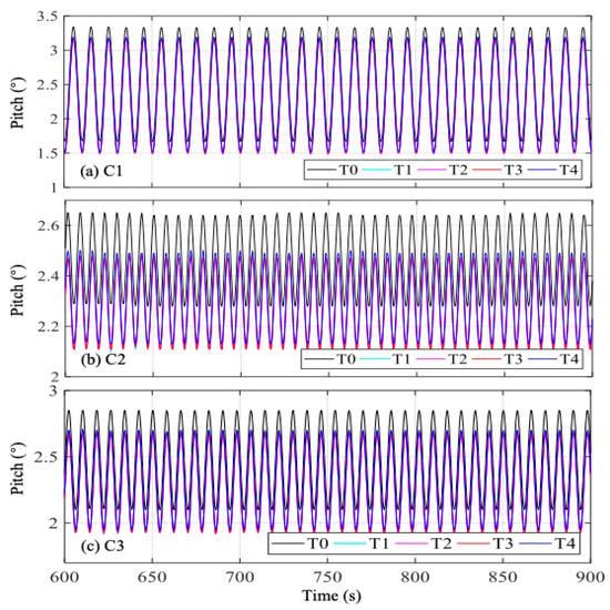 Figure 8 shows wind turbine pitch movements with T0–4 under C1–3. It can be seen that pitch movement of T0 was obviously larger than those of T1–4, especially in Figure 8b, implying that the developed mooring systems could effectively reduce wind turbine pitch movements by approximately 7% when under regular waves. In C1–3, the wind turbine pitch movement times series with T1–3 almost coincided with each other, indicating that the included angle between two mooring lines in the same group had a negligible effect on pitch movement control. The pitch movement of T4 was slightly larger than that of T3 with a difference of 0.03°. Hence, it can be said that when under regular waves, the wind turbine pitch movement could be reduced by both of the developed mooring systems with three and six fairleads, and the included angle has negligible effects on wind turbine pitch movement.