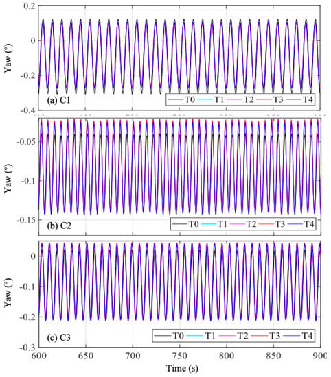 Figure 9 presents wind turbine yaw movements with T0–4 under C1–3. It can be observed that yaw movement of T0 had the maximum peak and minimum valley compared with those of T1–4; that is, yaw movement of T0 had the maximum amplitude compared with those of T1–4. The maximum difference between the amplitudes was approximately 10%. Interestingly, the yaw movement of T1–4 all almost coincided with each other, implying that the developed mooring systems had negligible effects on the yaw movement control. Increasing both the included angle and the number of fairleads could hardly improve the mooring system performance on yaw movement control.
